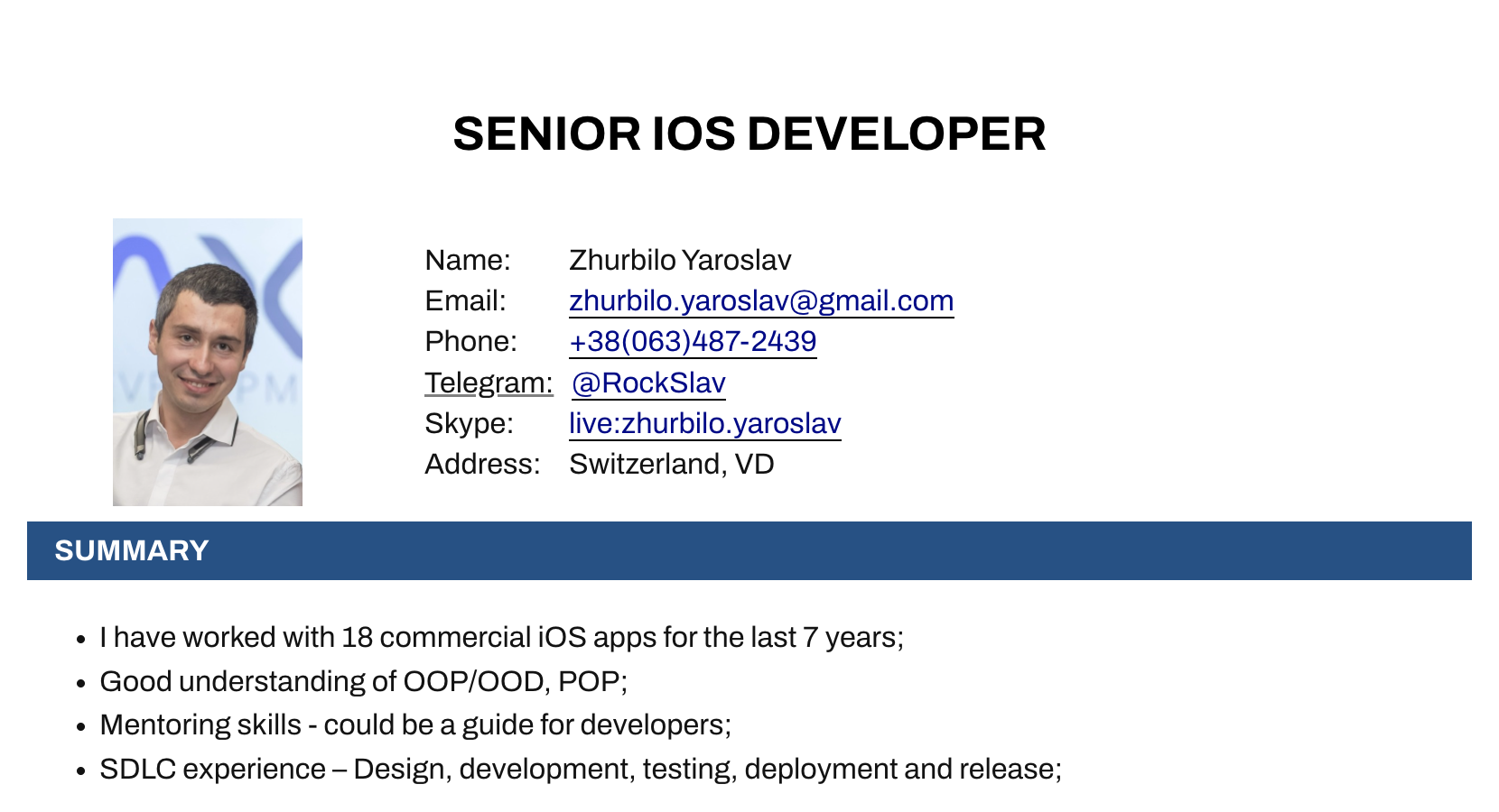 • I have worked with 18 commercial iOS apps for the last 7 years;